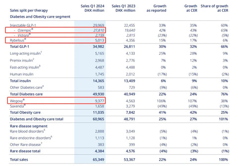 对比2023几个季度,GLP-1药物销量在持续增长,推动了诺和诺德糖尿病和肥胖护理这两个板块的业务增长。